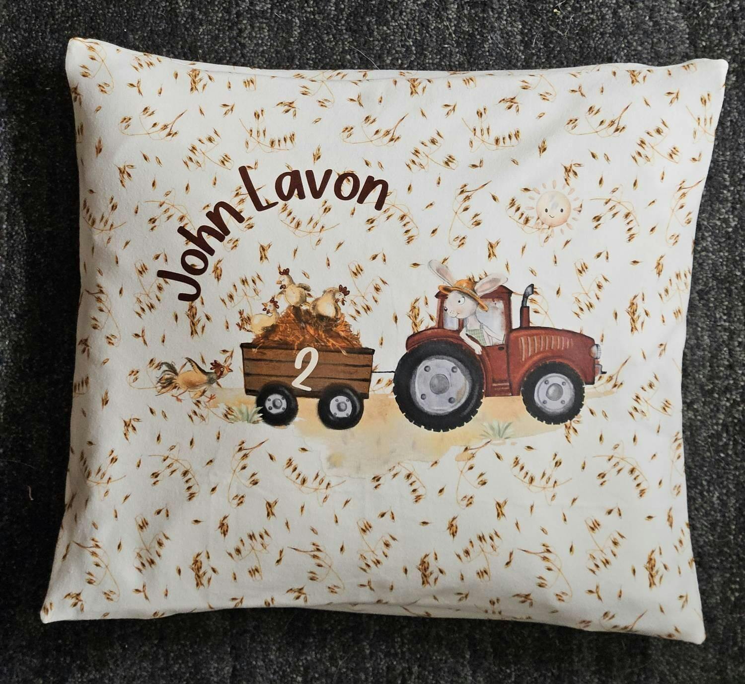 Bügelbild Traktor mit Anhänger – personalisiert mit Name & Zahl – Hühner und Hase – Bauernhof Aufbügler für geburtstag A4/A5