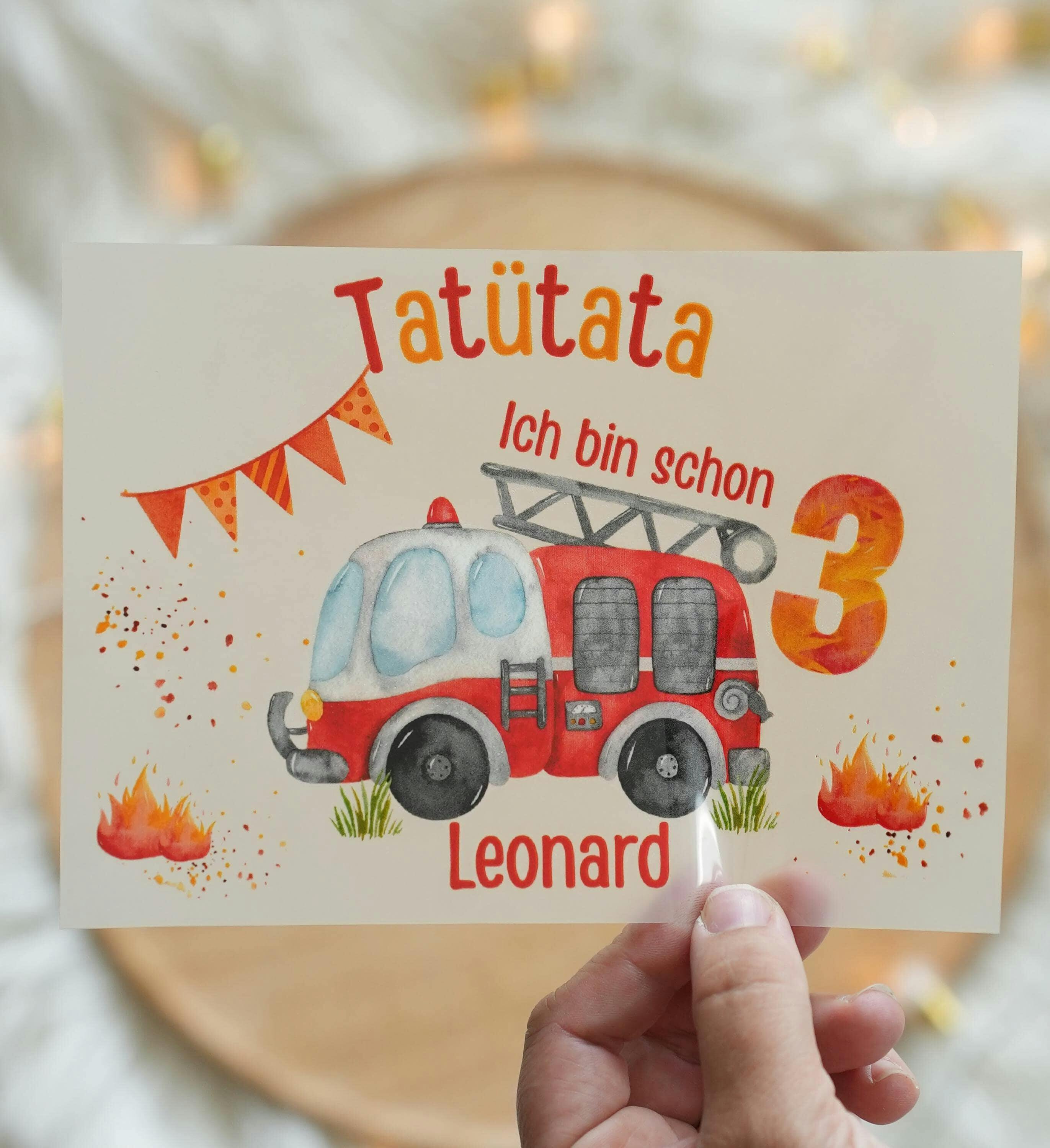 – Text: „Tatütata – Ich bin schon …“ + Wunschzahl + Name
