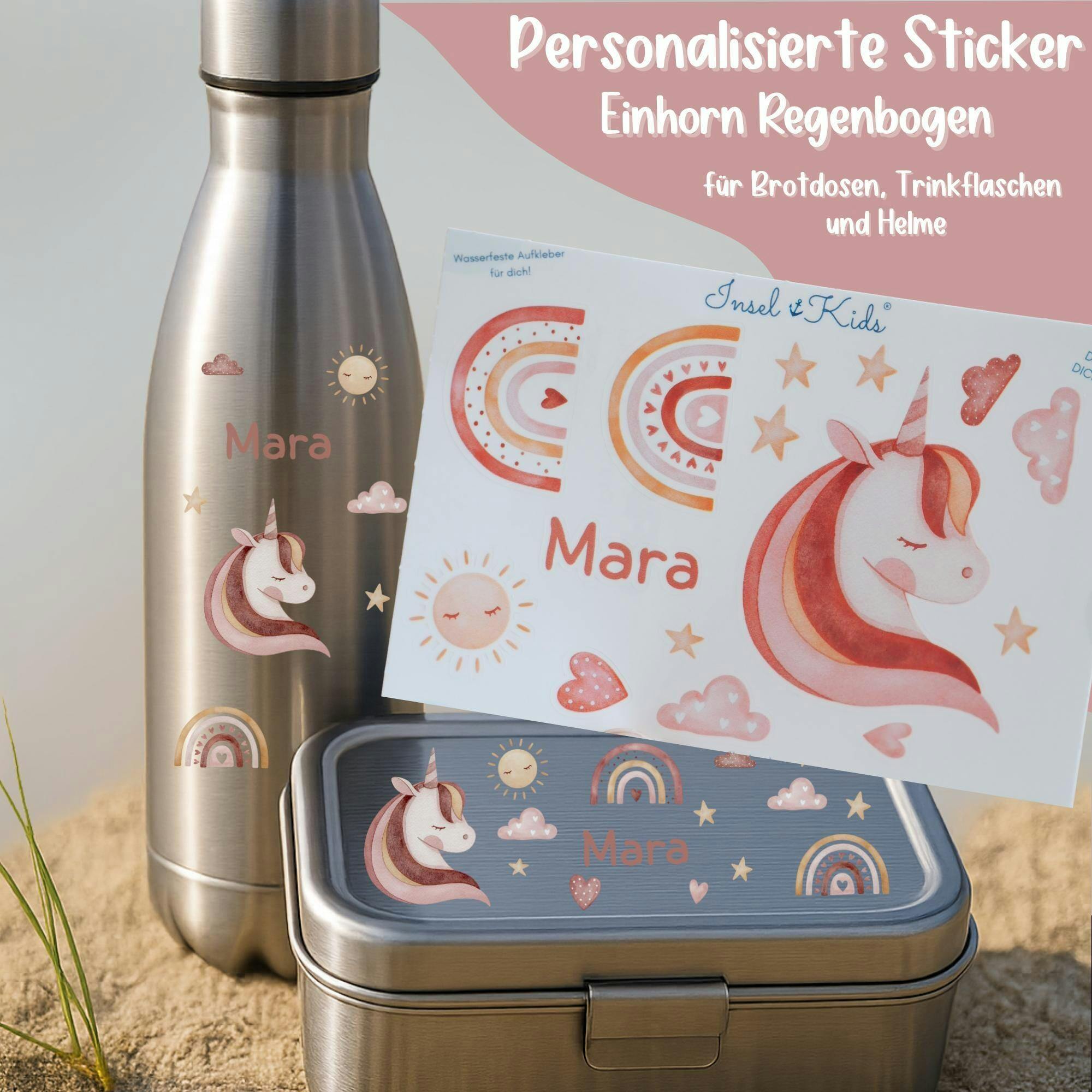 Einhorn Sticker mit Name – personalisiert & spülmaschinenfest – Aufkleber für Brotdose, Flasche, Schultüte – Geschenk Einschulung