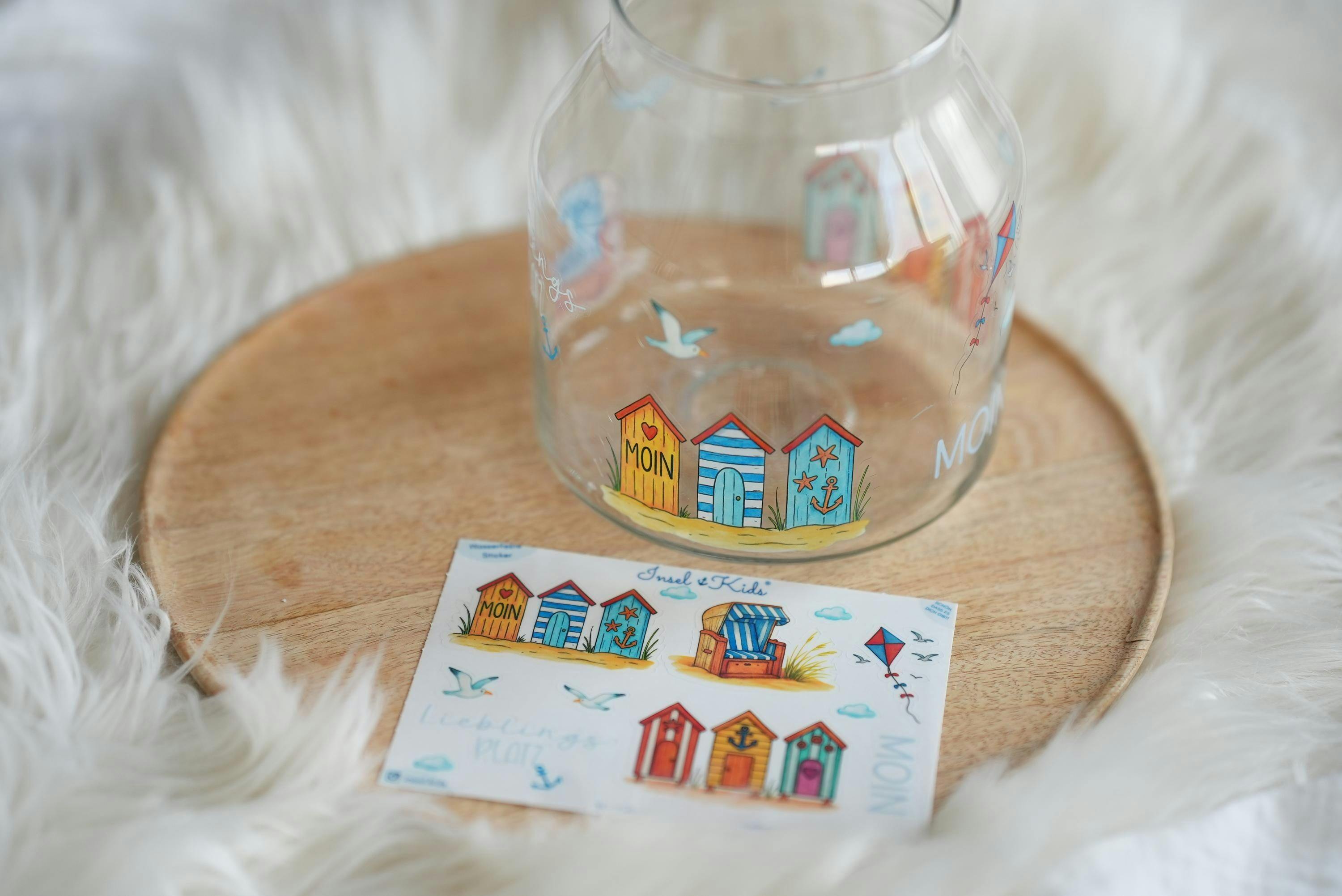 Maritimes Sticker-Set mit Strandhäuschen – wasserfest & spülmaschinenfest. Ideal für Windlichter, Gläser & DIY-Deko.