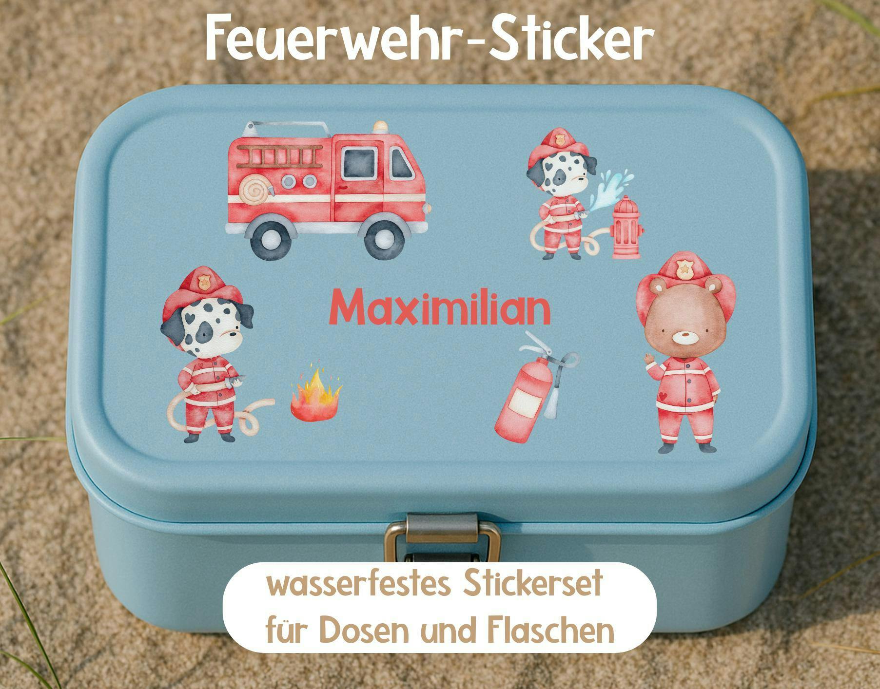 Personalisierte Sticker mit Feuerwehrhund & Feuerwehrbär – ideal für Brotdose, Flasche & Co.