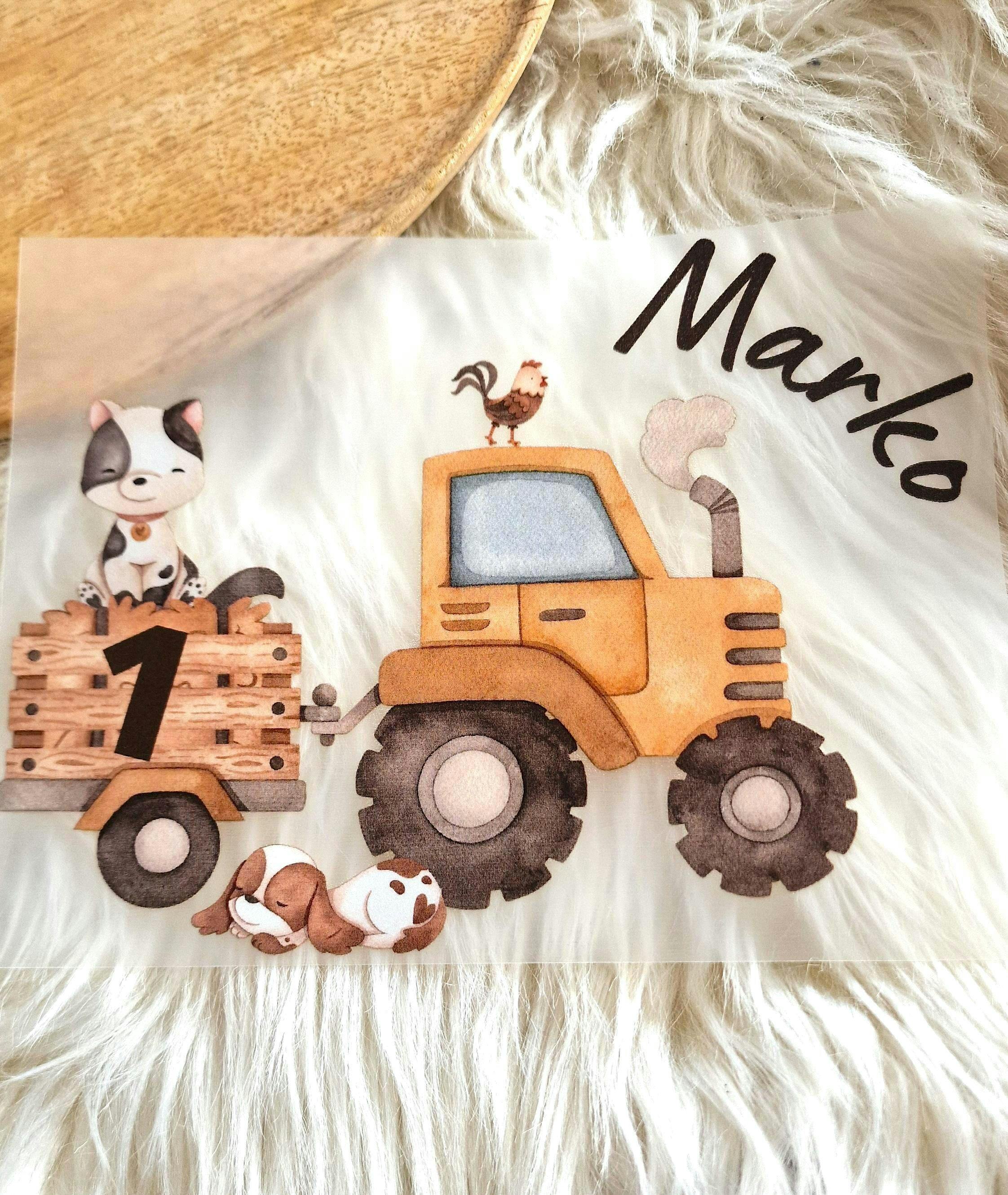 Bügelbild Traktor Bauernhof personalisiert mit Name und Alter für Kinder Geburtstagsshirt Bauernhoftiere Geschenk T-Shirt DIY