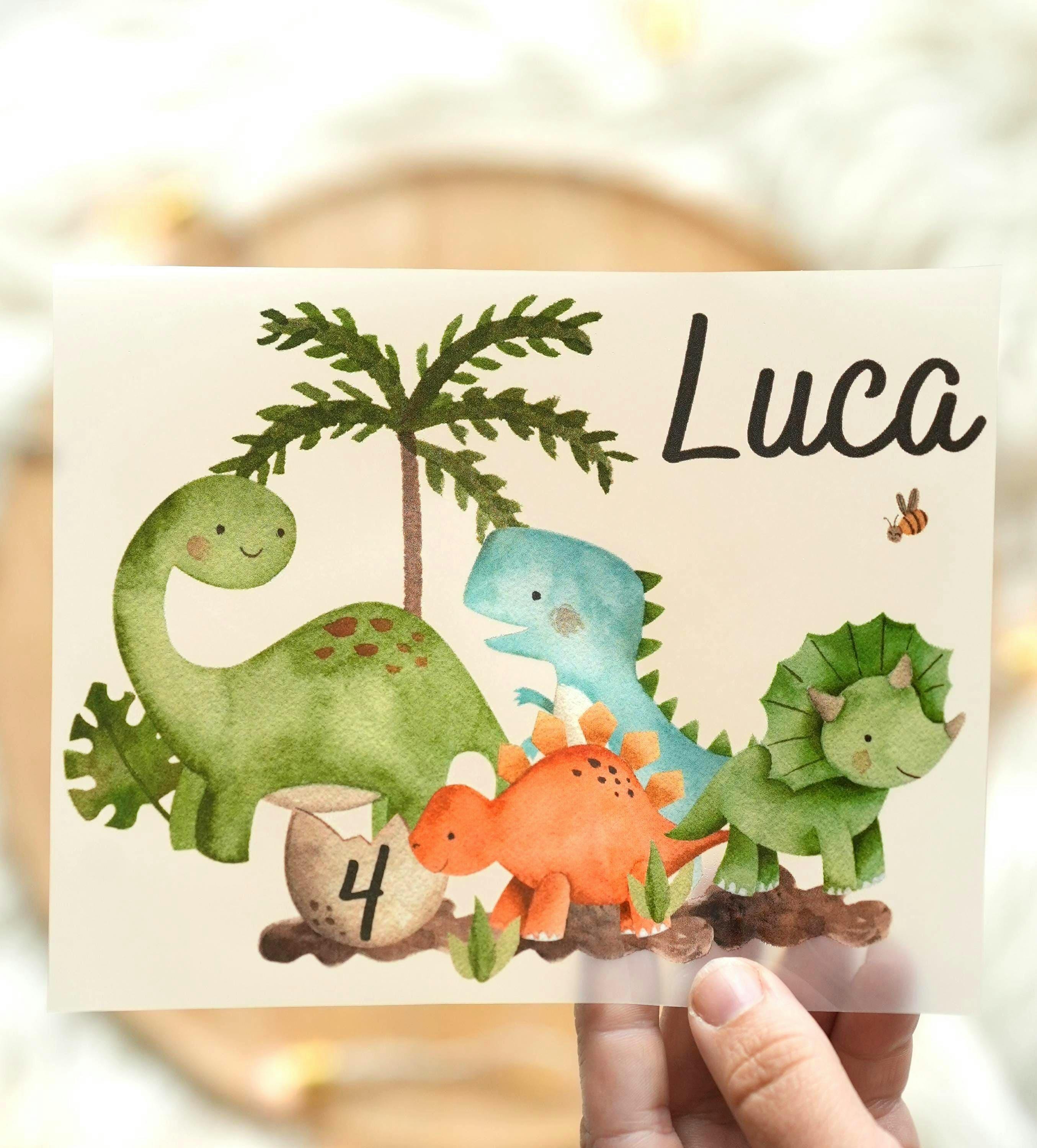 Dein Wunschname + Zahl auf einem liebevoll gestalteten Dino-Motiv