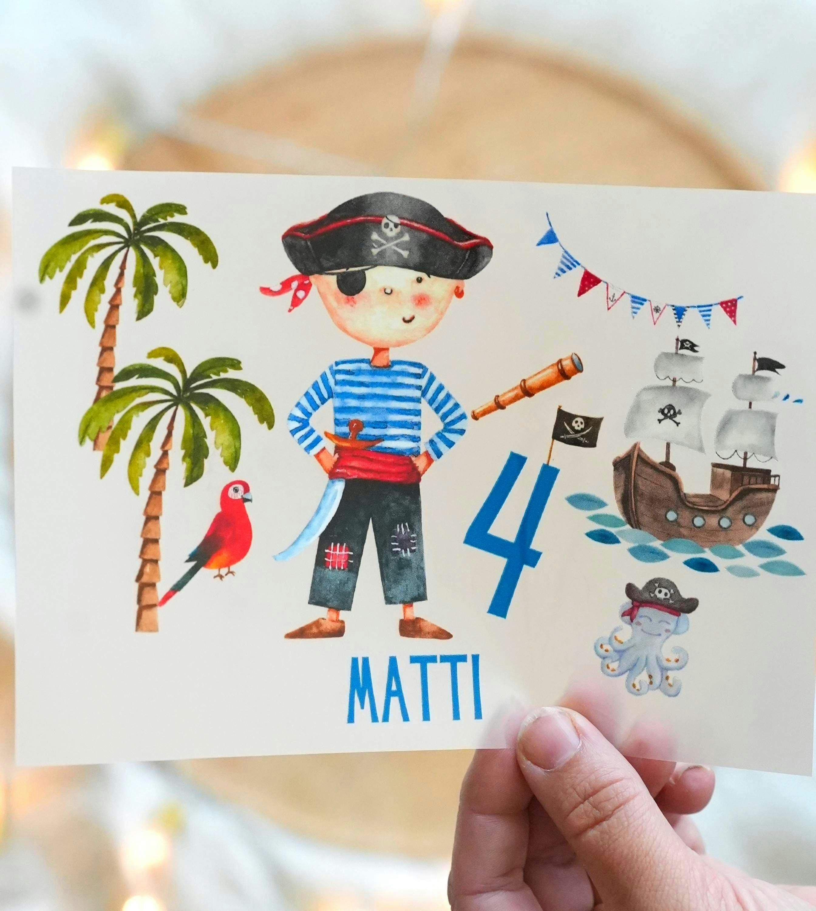 Dieses liebevoll gestaltete Bügelbild verwandelt im Handumdrehen jedes Kinder-Shirt in ein echtes Piraten-Abenteuer. Das Motiv zeigt ein fröhliches Piratenkind mit Augenklappe, Palme, Papagei, Wimpelkette und Piratenschiff – perfekt für Geburtstag, Kindergarten, Fotoshooting oder Motto-Party.