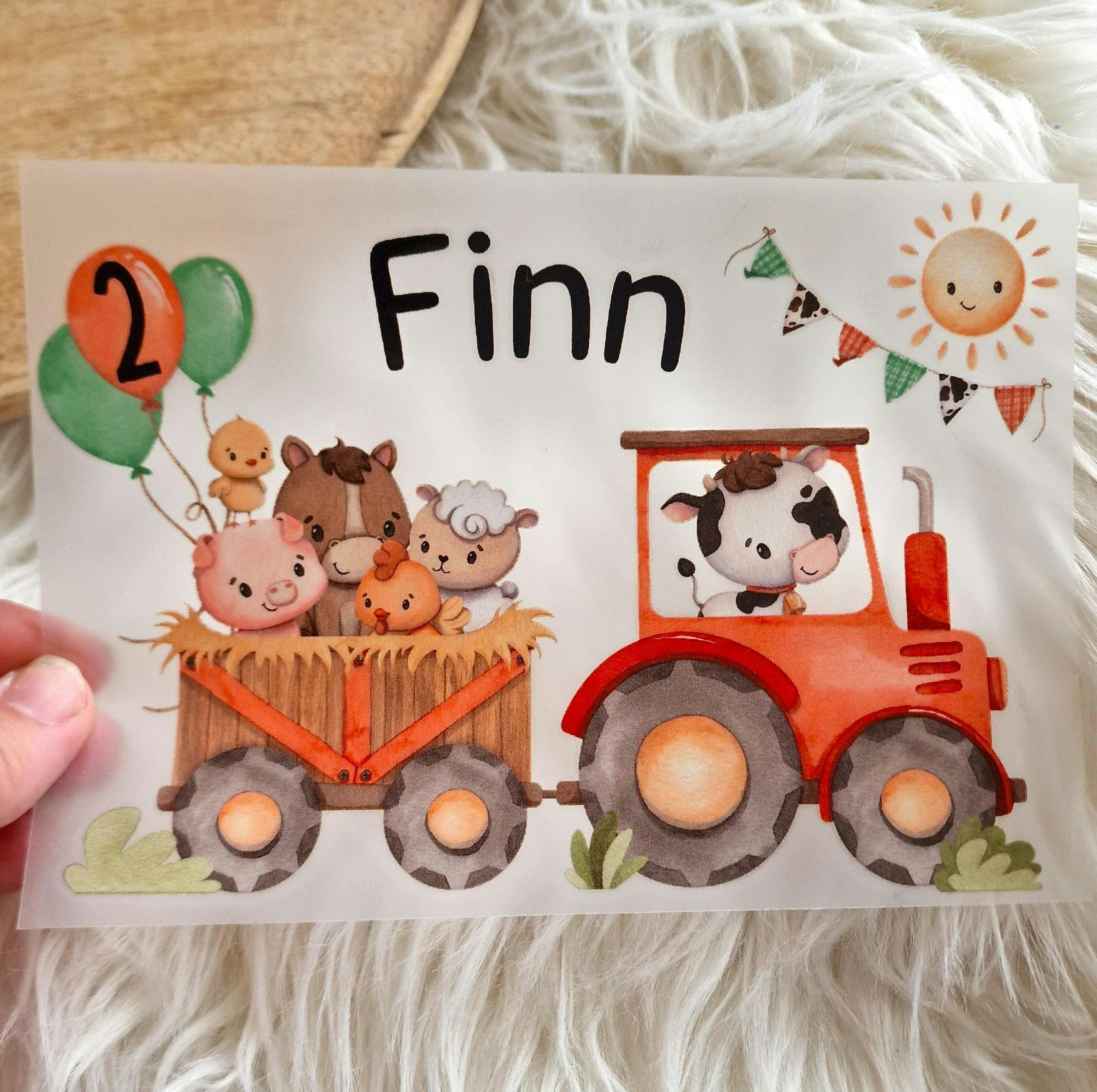 Dein Kind liebt Bauernhoftiere? Dieses Bügelbild mit Traktor, Name & Geburtstagszahl bringt Pferd, Kuh & Schaf aufs Shirt – perfekt zum Feiern!