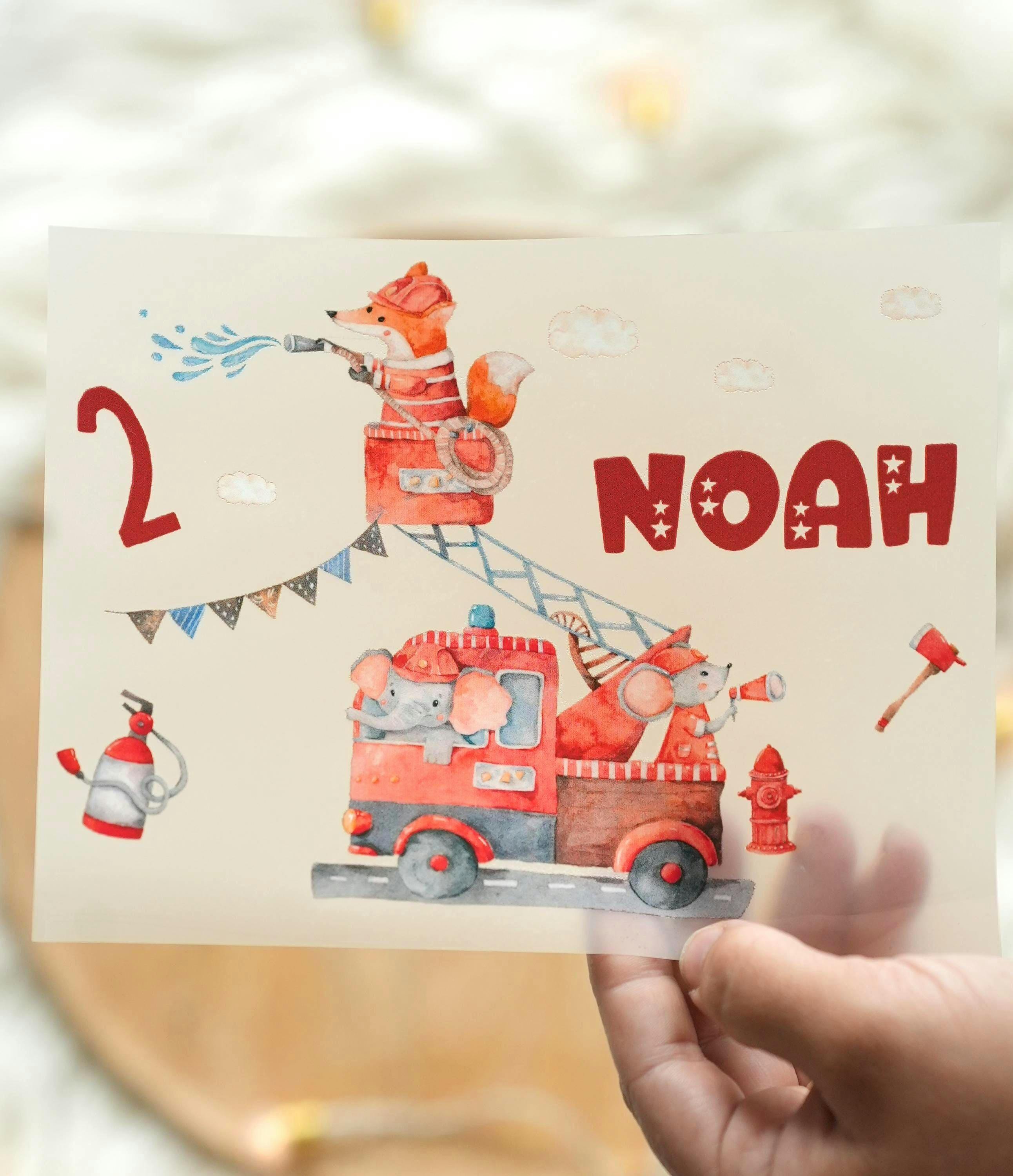 Bügelbild Feuerwehr mit Name & Alter – personalisiert – Feuerwehrauto Fuchs Elefant – Geburtstagsshirt – A4/A5
