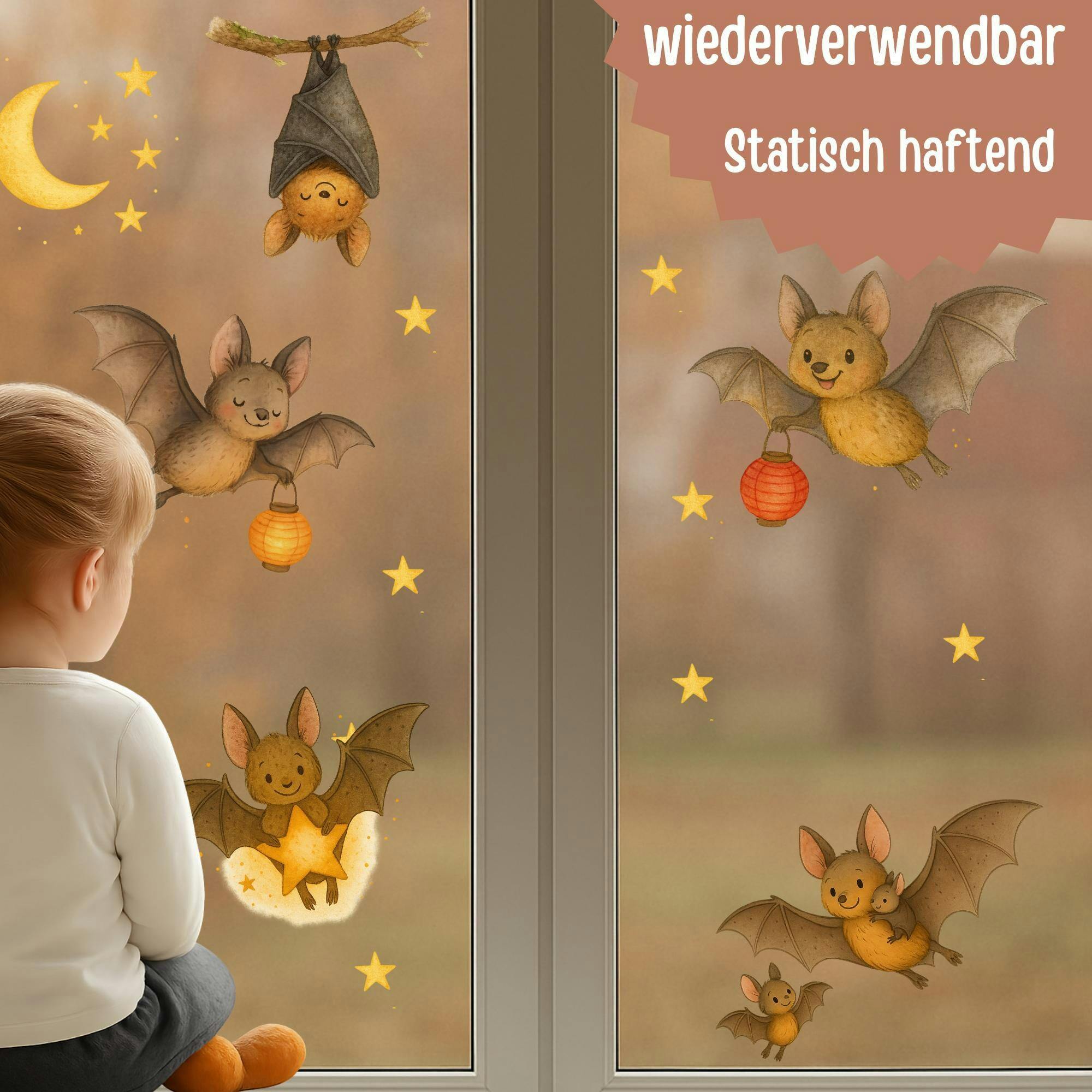 Die Fledermäuse sind kindgerecht und freundlich gestaltet – perfekt als Halloween Fensterdeko für Kinder oder als Herbstdeko Fenster im ganzen Haus. Sterne, Mond und kleine Laternen runden die Szene ab.