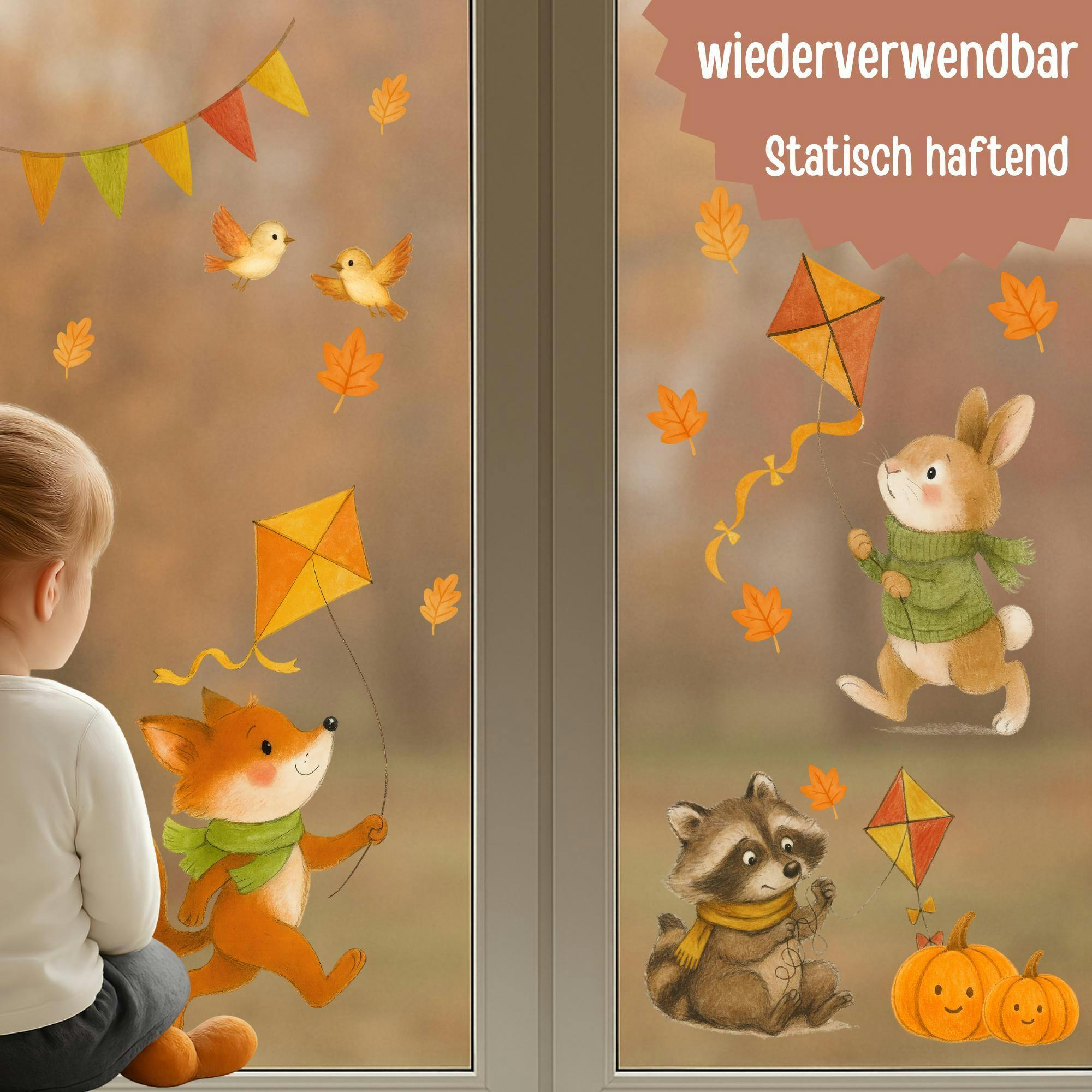 Dieses liebevoll illustrierte Fensterbild Herbst mit Fuchs, Hase und Waschbär bringt sofort Wärme und Gemütlichkeit in dein Zuhause. Mit bunten Blättern, Kürbissen 🎃 und Drachen wird jedes Fenster zum Blickfang.