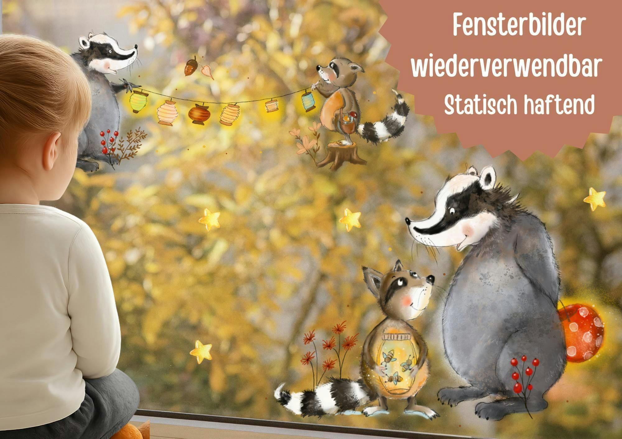 Fensterbilder Waldtiere – Fensterbild Dachs & Waschbär – deko Fenster wiederverwendbar A3 A4 A2 – Fensterdeko