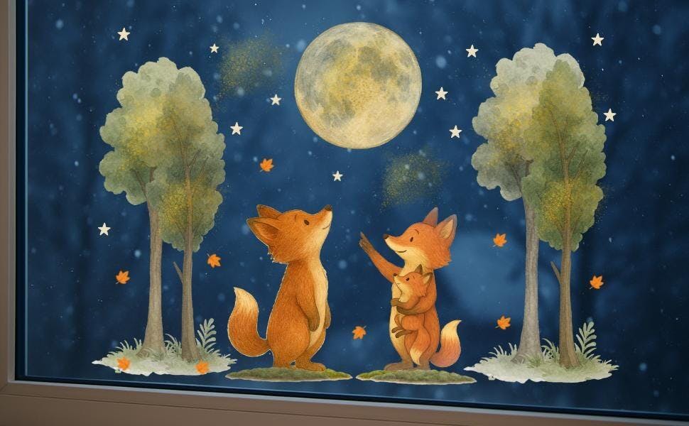 Dieses Fensterbild-Set mit Füchsen, Mond, Sternen und Bäumen bringt herbstliche Wärme in dein Zuhause. Die liebevollen Waldszenen passen perfekt zu Wohnzimmer, Küche, Kinderzimmer oder Flur und schaffen eine gemütliche Herbstatmosphäre.