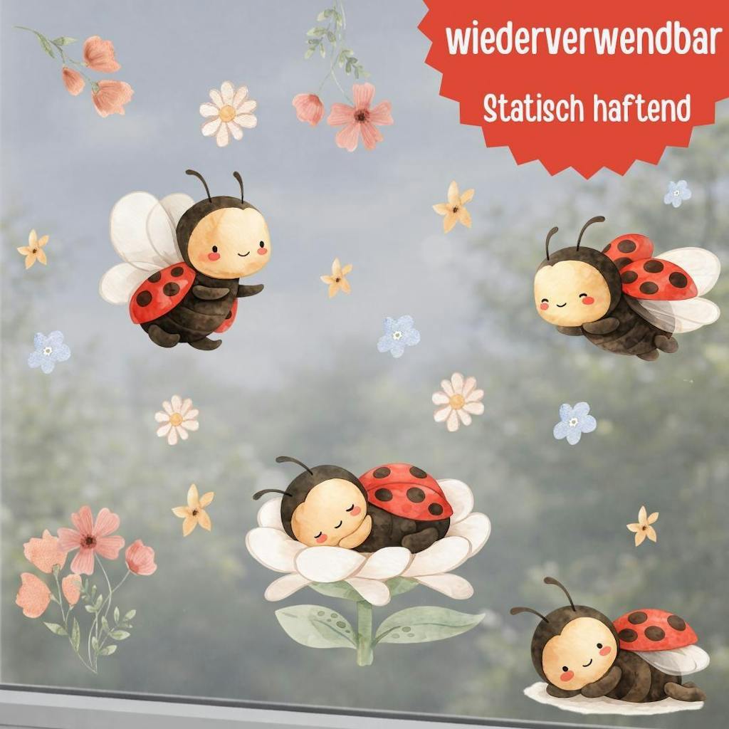 Frühlings-Fensterbilder Marienkäfer – statisch haftende Fensterdeko Frühling – Blumen & Käfer wiederverwendbar