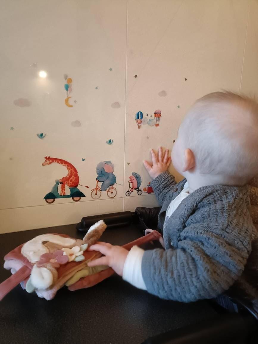 Giraffe, Elefant und Igel sind auf Rädern unterwegs, begleitet von Wolken, kleinen Vögeln und Ballons. Die Motive lassen sich einzeln platzieren und immer wieder neu anordnen – wie eine kleine Szene, die sich mit jedem Umsetzen verändert.