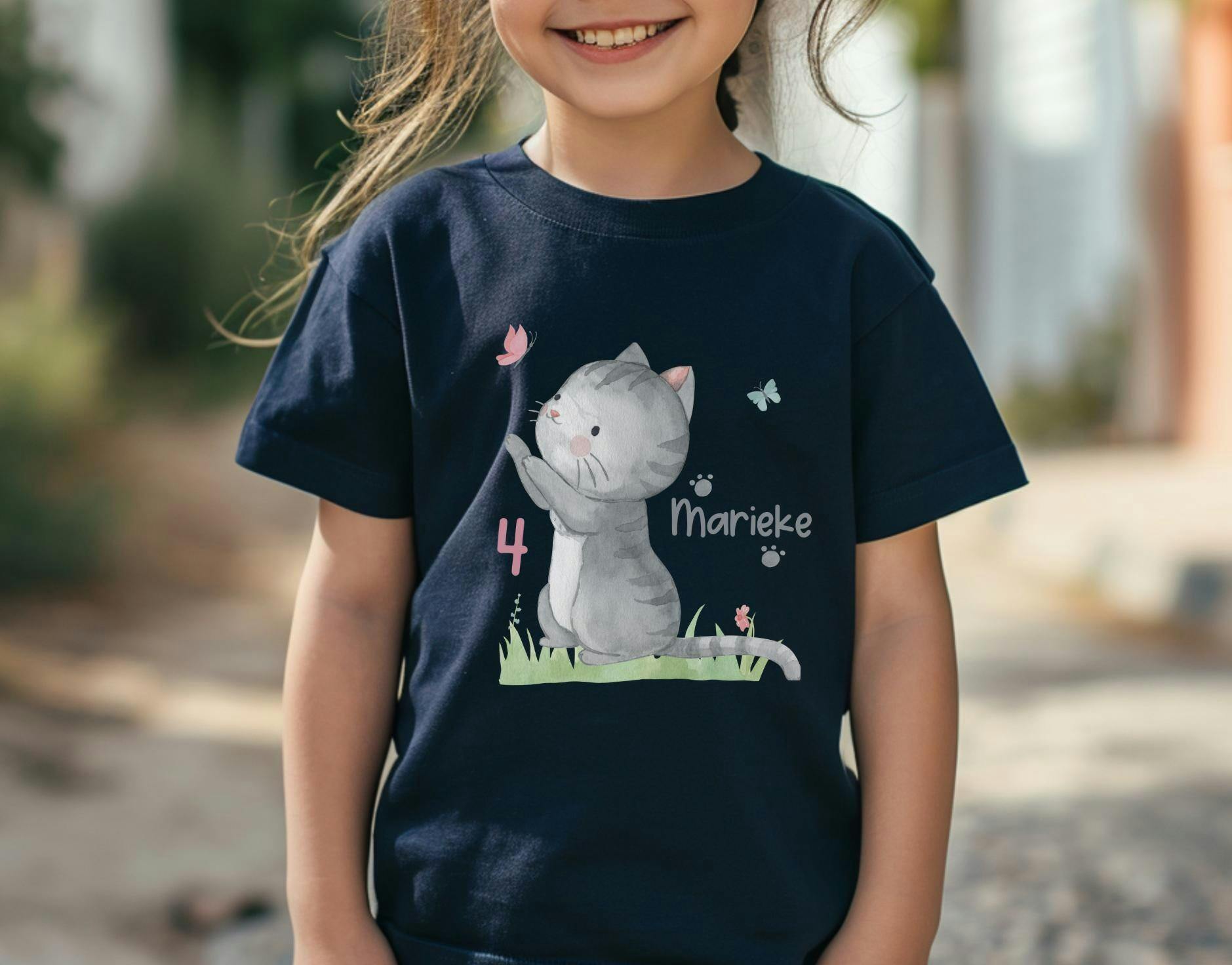 T-Shirt mit Aquarell-Katze, Wunschname & Zahl – aus weicher Baumwolle. Ideal als Geburtstagsoutfit oder alltagstaugliches Lieblingsshirt für Kinder.