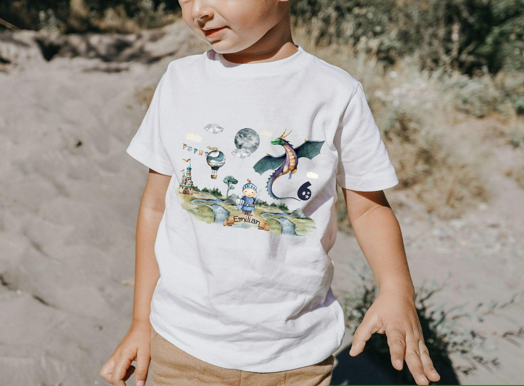 Ein fantasievolles Motiv mit Burg, Ritter und Drache lässt Kinderherzen höher schlagen. Die kräftigen Farben und liebevollen Details machen das Shirt zum Lieblingsstück – nicht nur am Geburtstag.