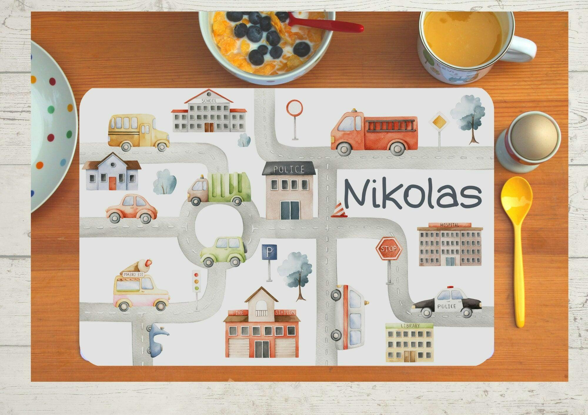 Platzdeckchen mit Name Stadt Straße Feuerwehr Polizei Müllwagen