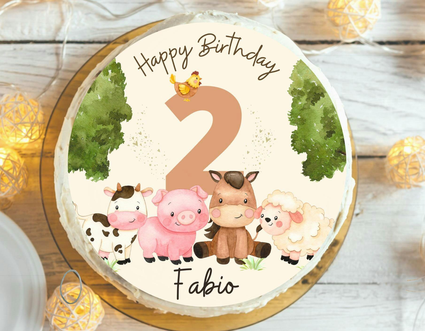 Tortenaufleger mit süßen Bauernhoftieren – personalisiert mit Name & Zahl für den perfekten Kindergeburtstag.