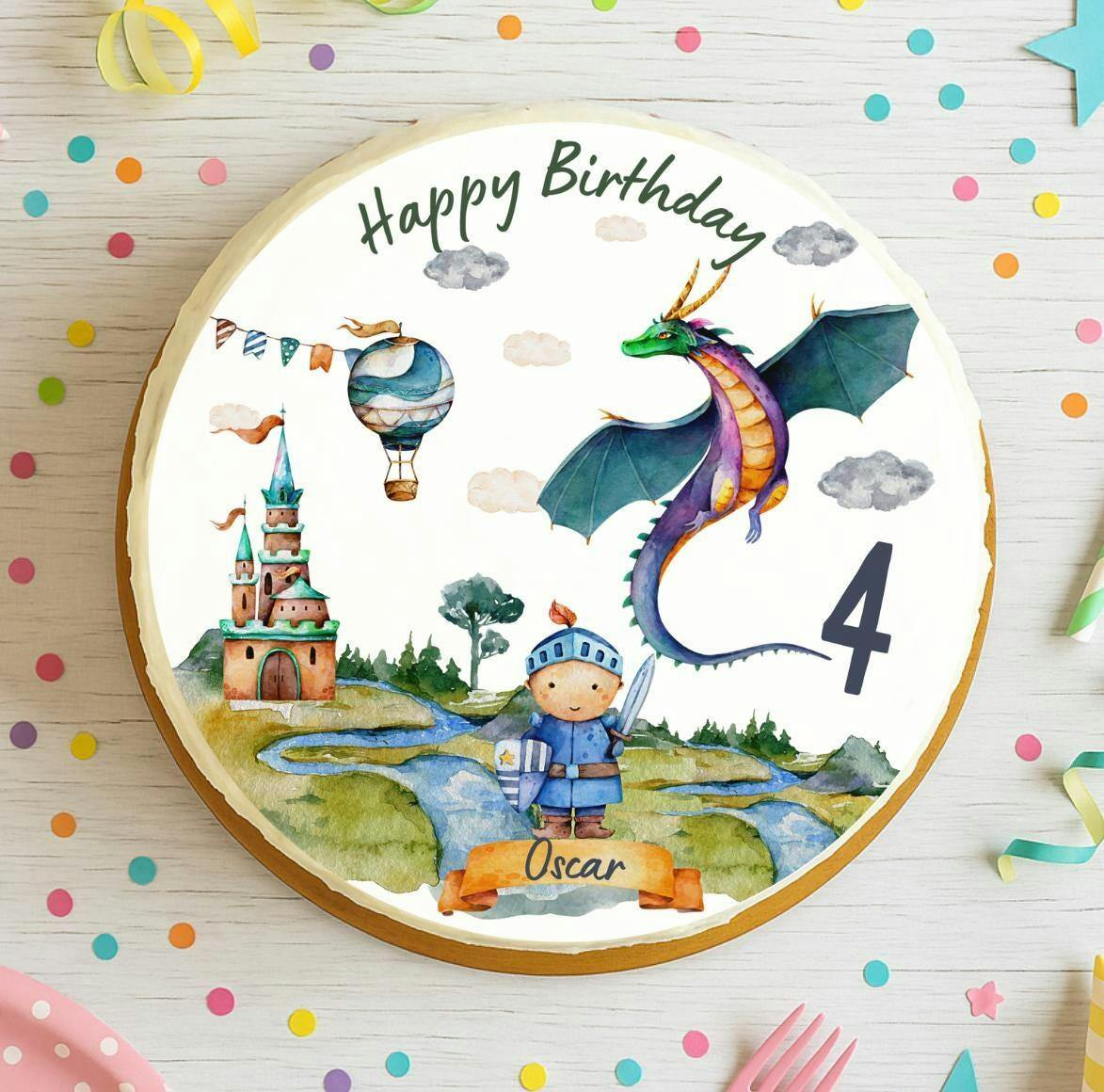 Dieser personalisierte Tortenaufleger mit Ritter & Drache macht die Geburtstagstorte zum Abenteuer. Für kleine Burgbewohner:innen, Drachendompteur:innen und alle Kinder, die sich auf ihrer Feier wie ein echter Held fühlen wollen.