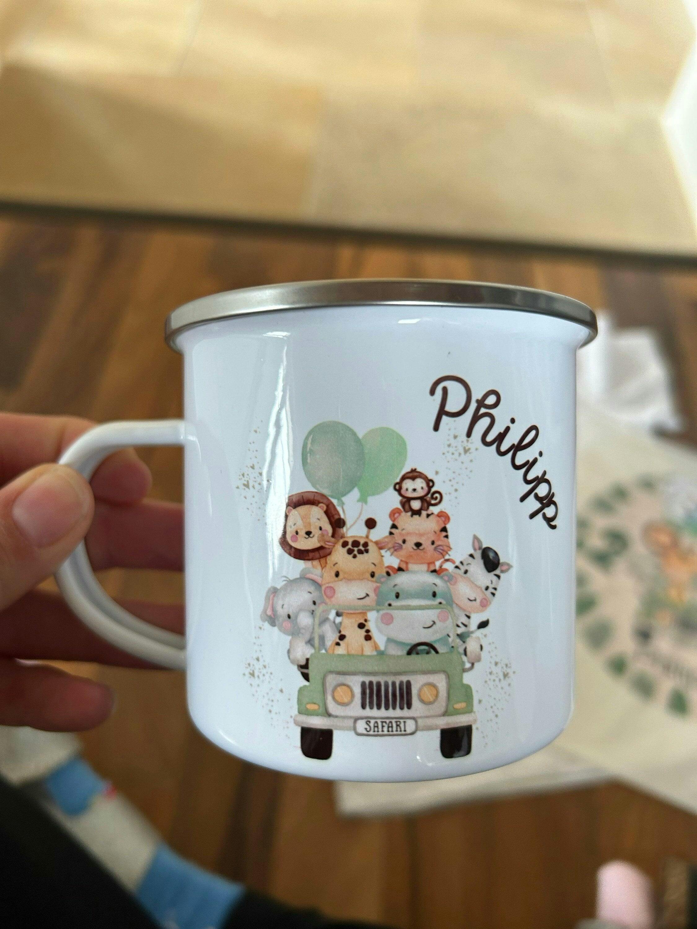 Die fröhlichen Safari-Tiere – Löwe, Giraffe & Elefant – fahren in einem rosa Jeep über den Dschungelpfad, begleitet von bunten Ballons. Auf dem Nummernschild? Der Name & das Alter deines Kindes – individuell für dich aufgedruckt.