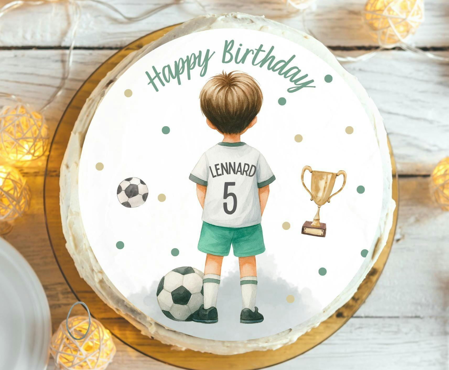 Moderner Fußball-Tortenaufleger mit Trikot, Name & Zahl – für Kindergeburtstage ab 4 Jahren. Essbar & individuell personalisierbar.