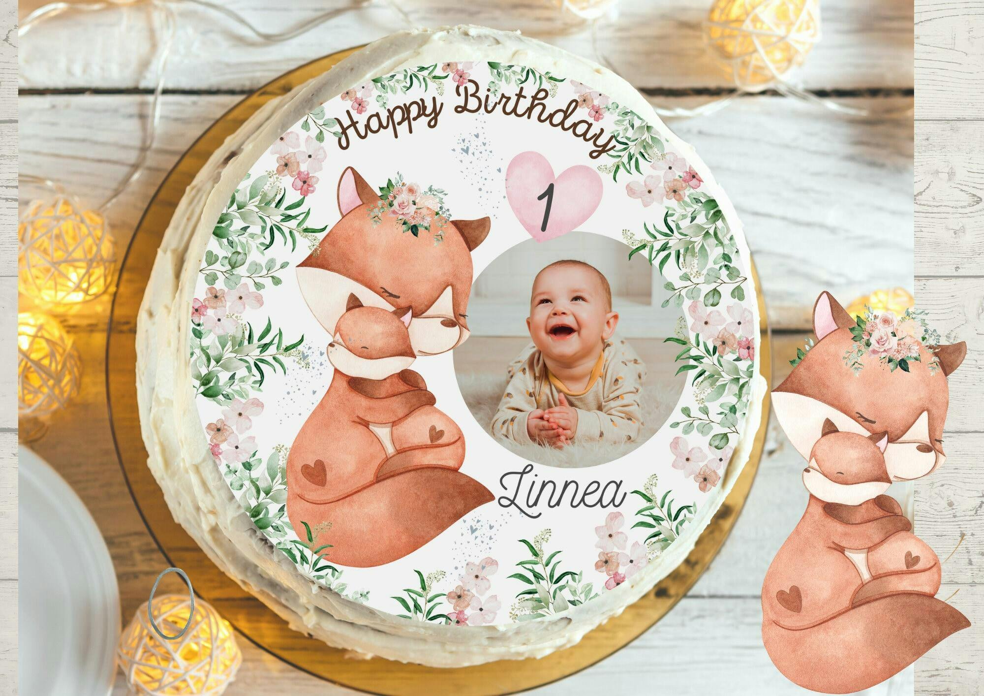 Mit diesem liebevoll gestalteten Tortenaufleger wird jede Geburtstagstorte zum ganz persönlichen Highlight! Das süße Motiv zeigt ein Fuchs-Mama-und-Baby-Duo – eingebettet in sanfte Farben, harmonische Details und ergänzt durch dein Wunschfoto, den Namen und das Alter des Geburtstagskindes.