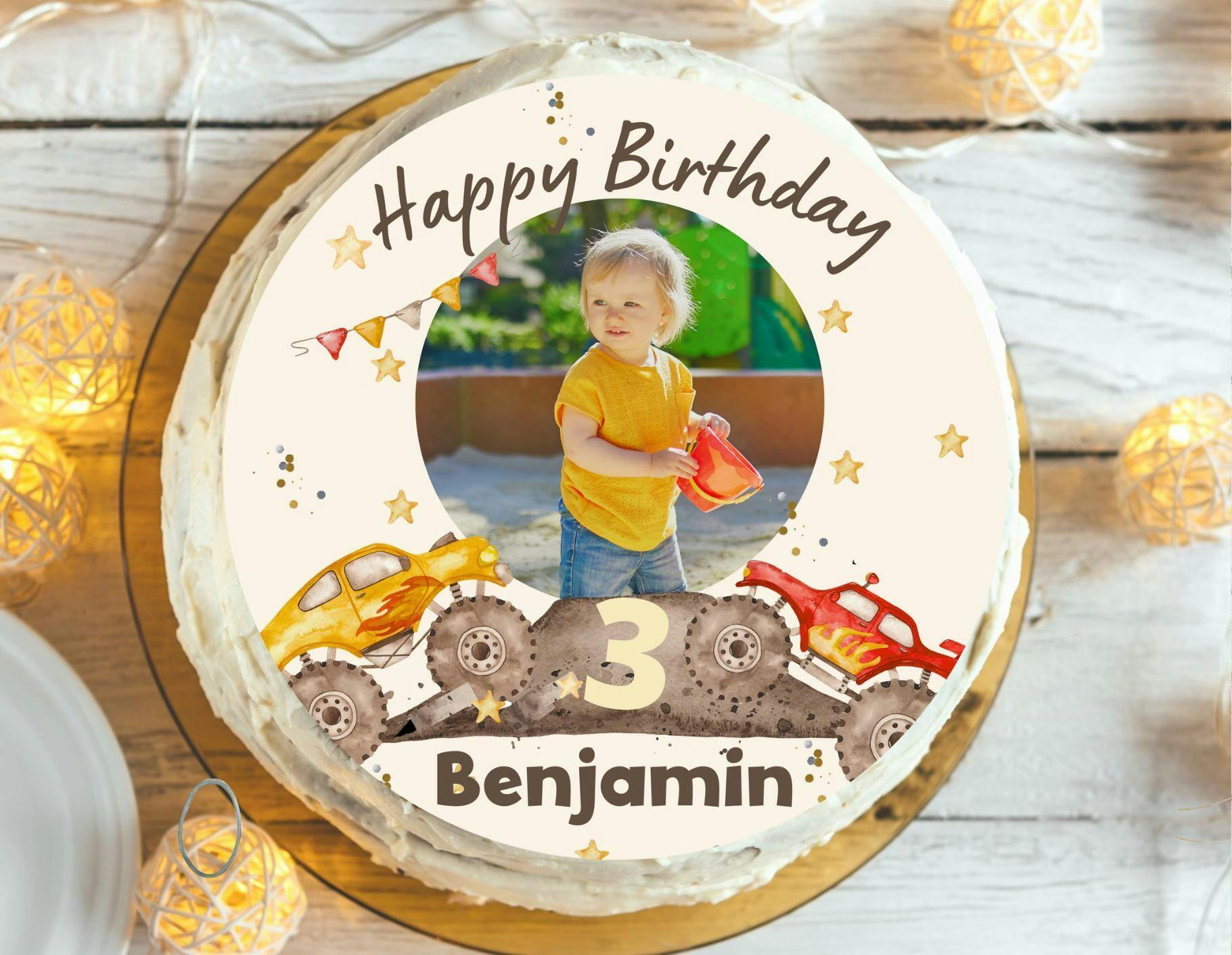 Personalisierter Monstertruck-Tortenaufleger mit Foto, Name & Alter – essbares Zuckerbild für Kindergeburtstag, runde Fondant-Deko