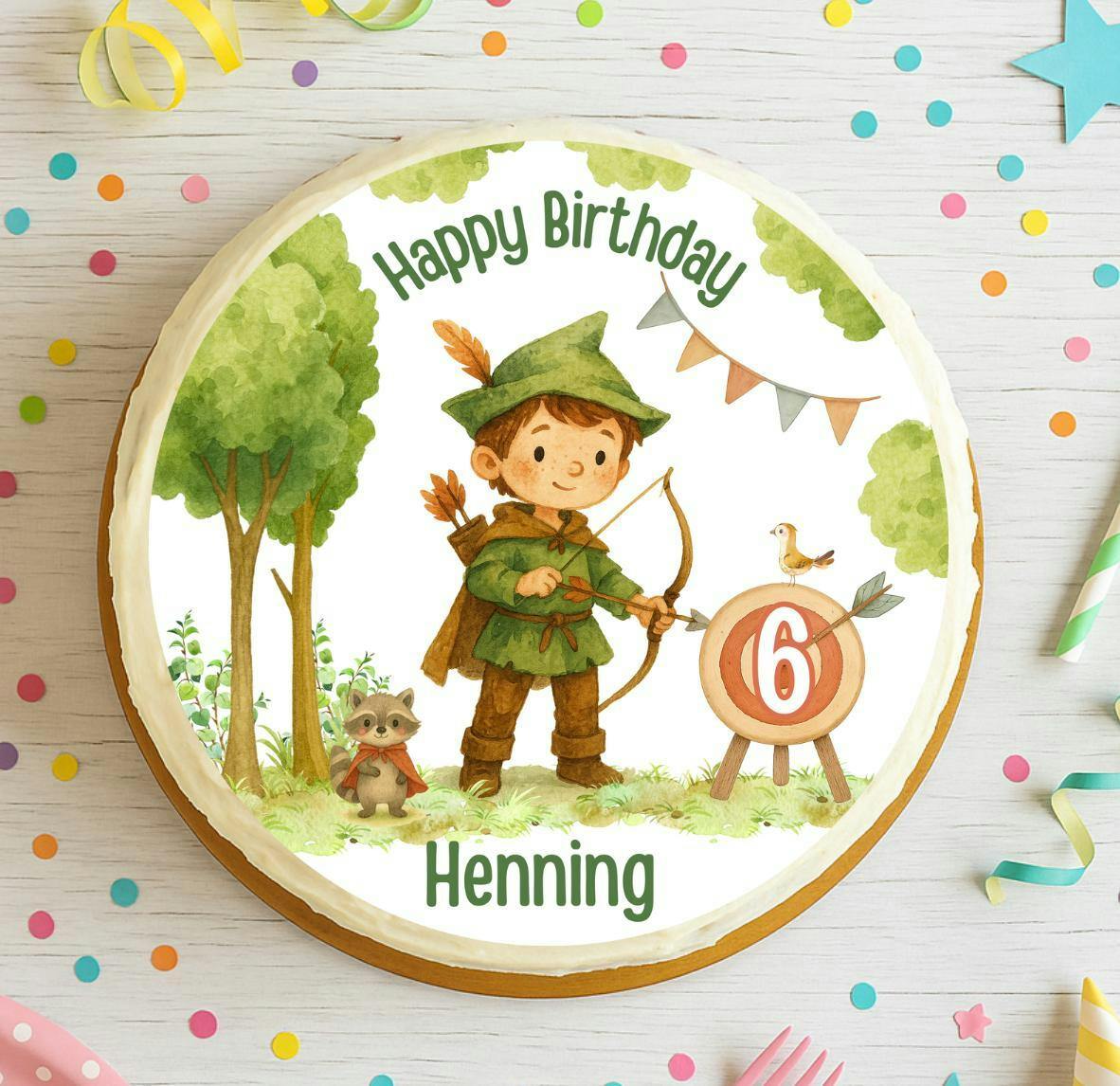 Essbarer Tortenaufleger im Robin-Hood-Stil – mit Wunschname und Alter personalisiert. Perfekt für Wald-, Mittelalter- oder Abenteuer-Geburtstage.