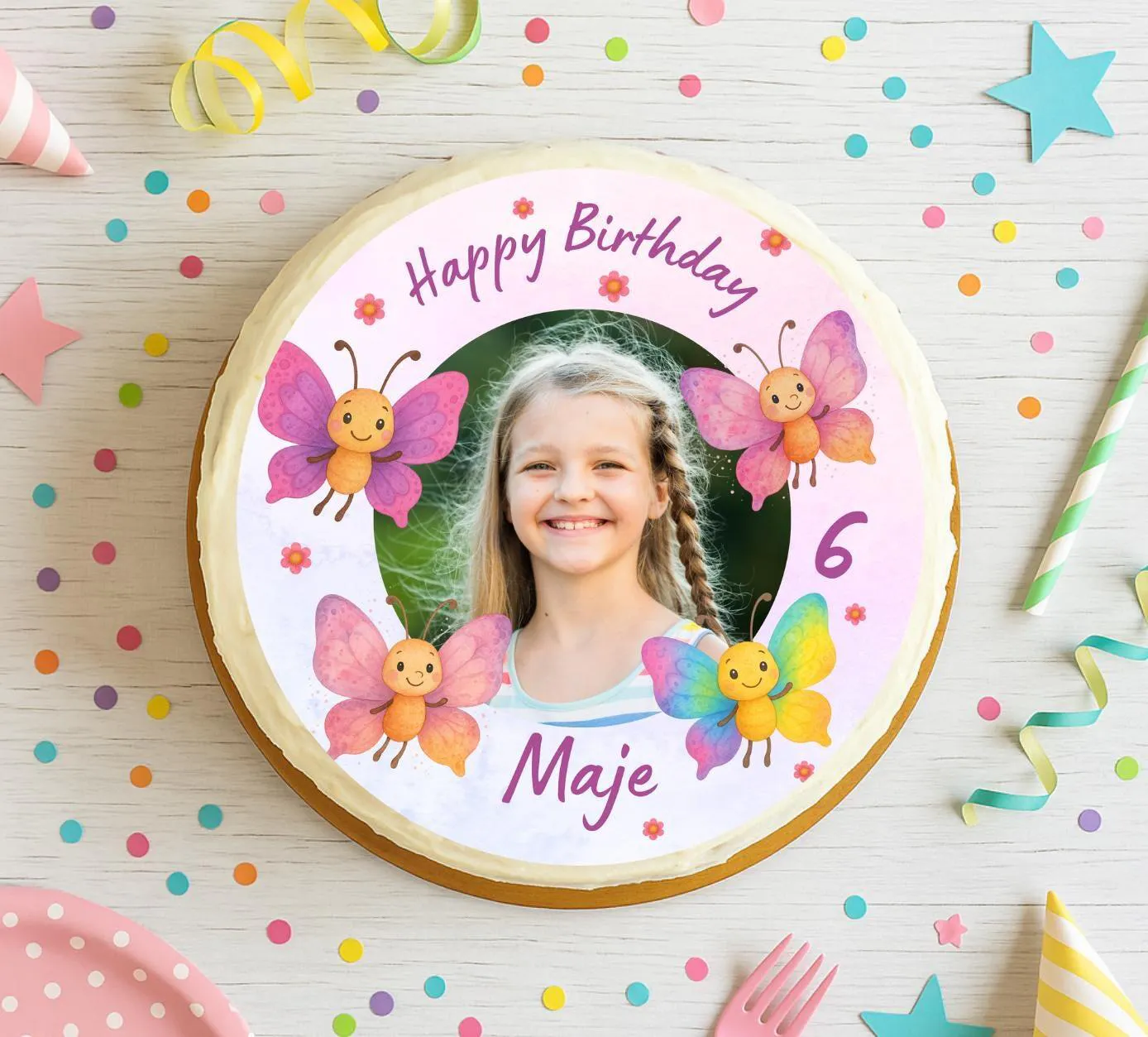 Wenn du deine Tochter am Geburtstag mit leuchtenden Augen erleben willst, ist dieser Tortenaufleger wie gemacht für euch. Die süßen Schmetterlinge flattern in Rosa, Lila und Regenbogenfarben rund um das Foto deines Kindes – mittendrin: ihr Name und ihre Zahl. So wird aus einem einfachen Kuchen eine persönliche Erinnerung zum Mitnaschen.