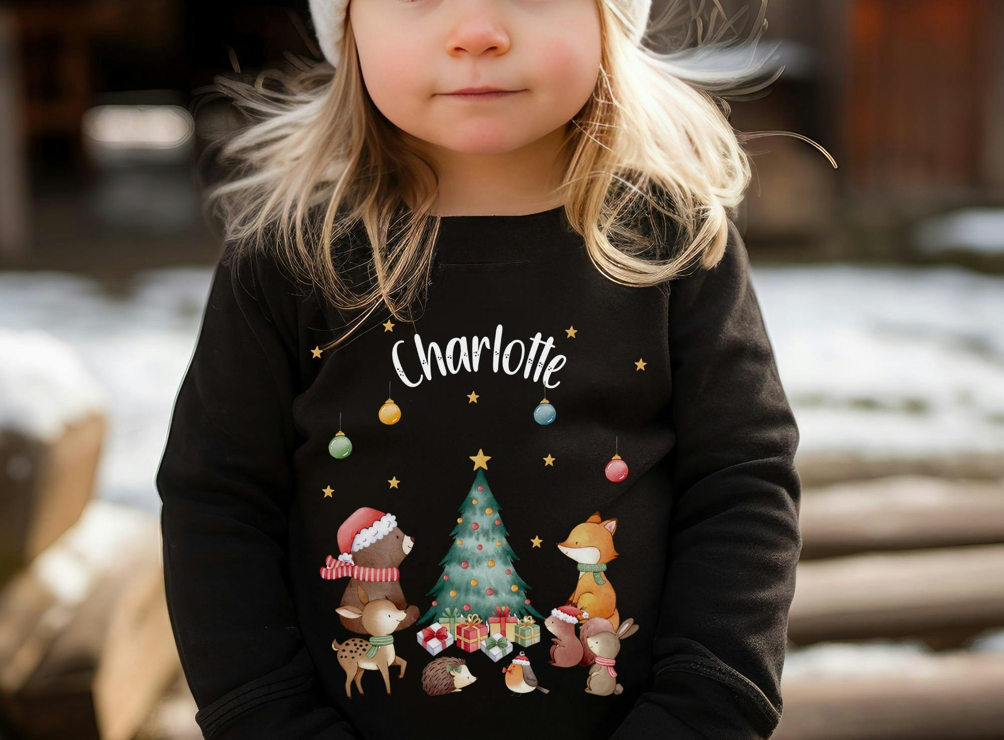 🎁 Personalisiertes Weihnachtsshirt mit Waldtieren & Name – liebevoll bedruckt, weich & festlich – perfekt für Kinder zu Weihnachten & Advent!